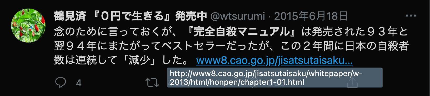 ところで著者のTwitterによると、『完全自殺マニュアル』が発売された93年と翌94年は、自殺率が減ったそうです。